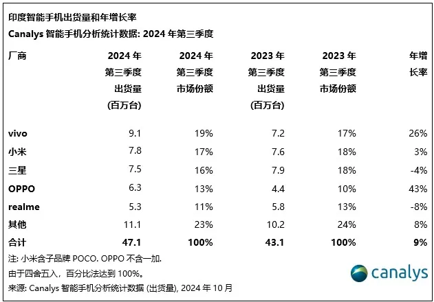 10月18日,市場調研機構Canalys發佈的數據顯示,2024年第三季度,印度智能手機市場增長9%,出貨量達4710萬台。