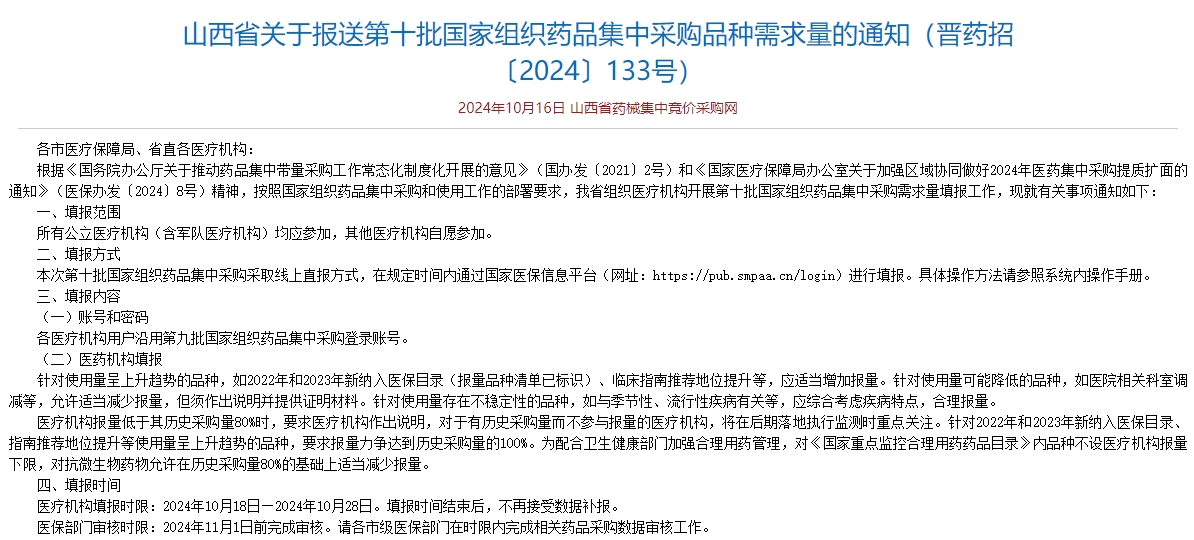 10月16日,山西省藥械集中競價採購網率先發布《關於報送第十批國家組織藥品集中採購品種需求量的通知》(下稱《通知》)。根據《通知》中披露的報量藥品清單文件來看,本次國家藥品集採納入62個品種共263個品規,創歷次國家藥品集採數量新高。