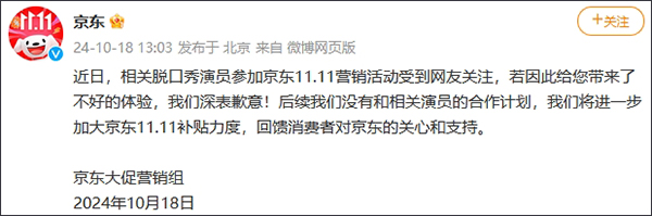 @京東 10月18日發佈京東大促營銷組聲明稱,近日,相關脱口秀演員參加京東11.11營銷活動受到網友關注,若因此給您帶來了不好的體驗,我們深表歉意!後續我們沒有和相關演員的合作計劃,我們將進一步加大京東11.11補貼力度,回饋消費者對京東的關心和支持。