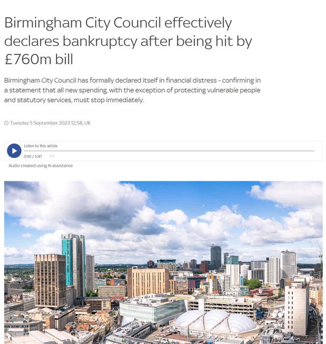 英國伯明翰市政府宣佈破產,陷入財政危機