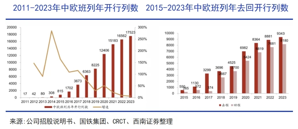2011年,中歐班列正式發車,走過了頭三四年不足100列的摸索期,2014-2021年狂飆突進,2022年步入平穩發展階段。2023年,全年開行超過1.7萬列,發送190萬標箱,同比分別增長6%、18%。