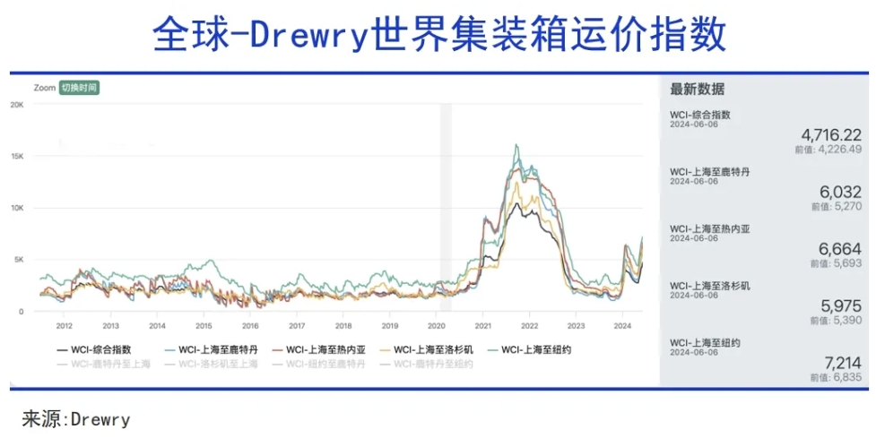6月6日,Drewry公佈的世界集裝箱運價指數(WCI) 達到每40英尺集裝箱4716美元,創年內新高,環比上週上漲12%。要知道該指數價格在2019年的平均值才1420美元,相當於高出2.3倍。