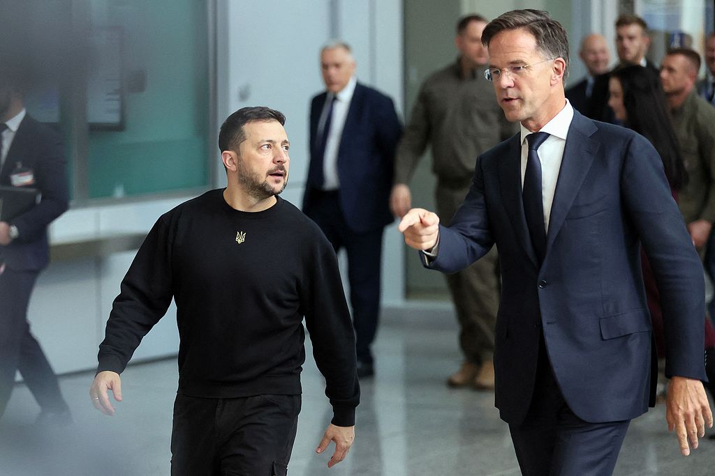 當地時間10月17日,比利時布魯塞爾,北約秘書長馬克·呂特與烏克蘭總統澤連斯基會面。視覺中國