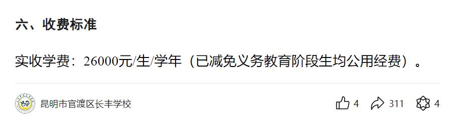 另一位家長彭先生稱:“這個學校(長豐學校)是昆明市初中升學率排前10的學校中,唯一一所不看地域的,不需要學區房、劃片,憑分數夠就能進,所以還是比較搶手的。兩萬六的學費還沒有包含延時費和餐飲費。”
