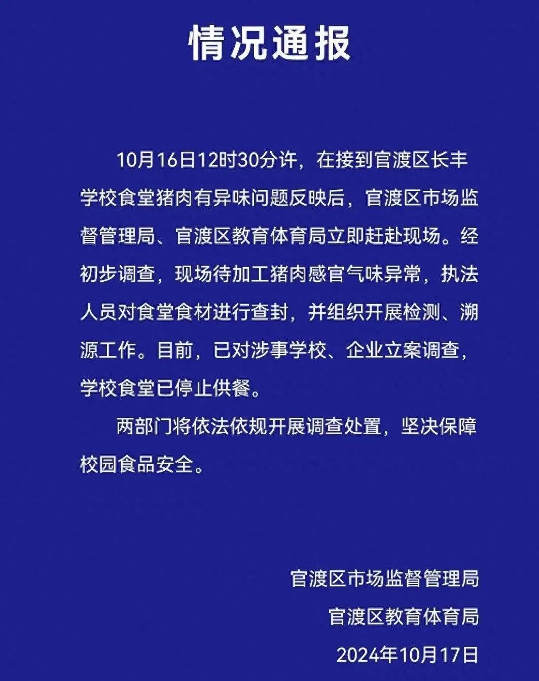 10月16日12時30分許,在接到官渡區長豐學校食堂豬肉有異味問題反映後,官渡區市場監督管理局、官渡區教育體育局立即趕赴現場。經初步調查,現場待加工豬肉感官氣味異常,執法人員對食堂食材進行查封,並組織開展檢測、溯源工作。目前,已對涉事學校、企業立案調查,學校食堂已停止供餐。