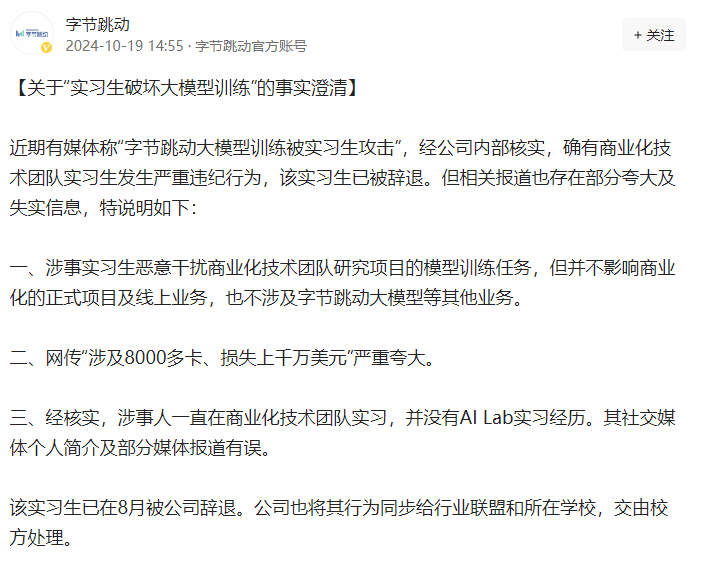 據字節跳動今日頭條官方賬號消息,字節跳動10月19日發佈關於“實習生破壞大模型訓練”的事實澄清:
