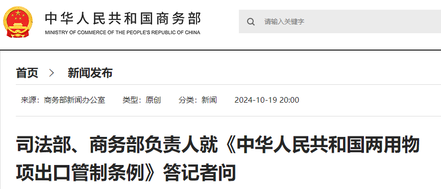 據商務部網站19日消息,2024年9月30日,國務院總理李強簽署第792號國務院令,公佈《中華人民共和國兩用物項出口管制條例》(以下簡稱《條例》),自2024年12月1日起施行。日前,司法部、商務部負責人就《條例》的有關問題回答了記者提問。
