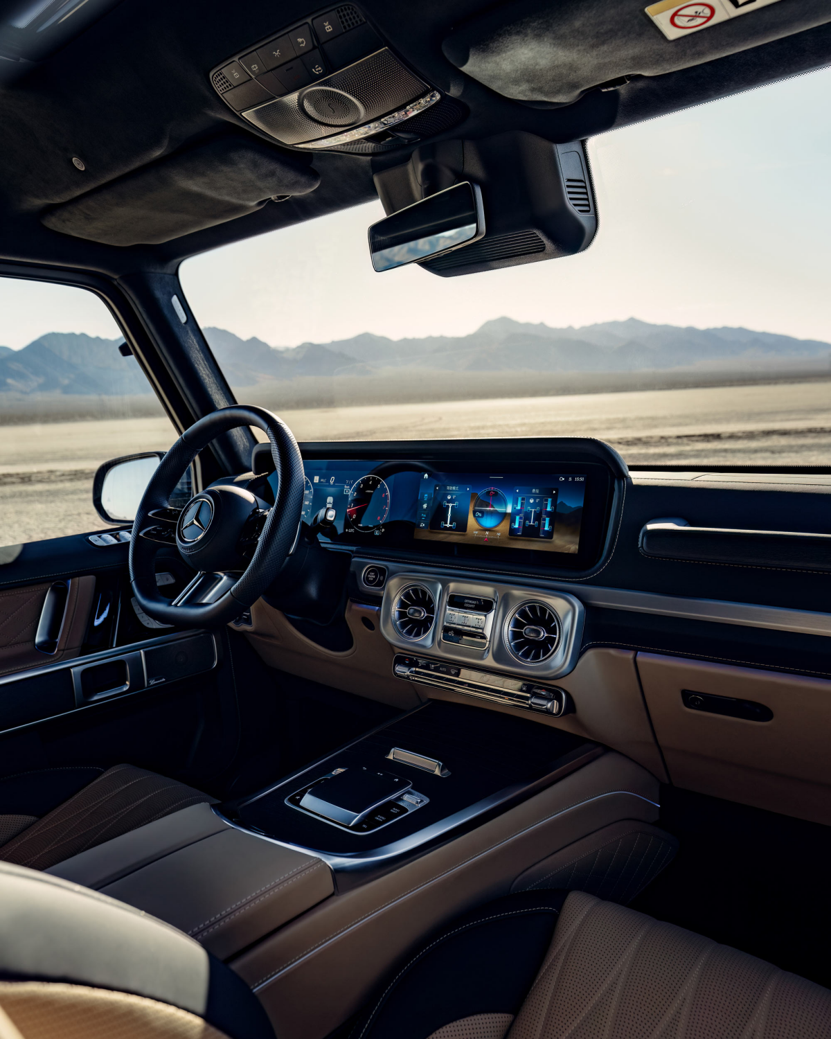 在此基礎上,全新G 500還換裝了四幅飾條前格柵和全新前後保險槓設計,並對A柱、車頂擾流板、輪轂進行了更多空氣動力學優化,經典的機械式門把手也新增無鑰匙進入功能。