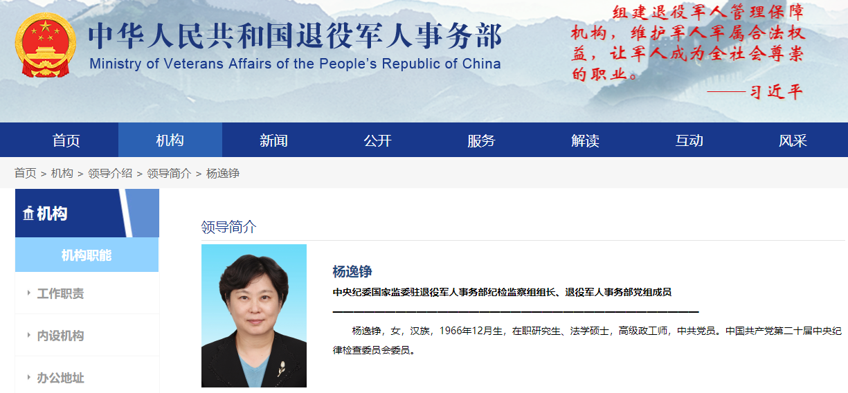 同日,退役軍人事務部網站“領導介紹”欄目更新顯示:楊逸錚已任中央紀委國家監委駐退役軍人事務部紀檢監察組組長、退役軍人事務部黨組成員。