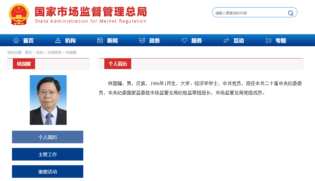 10月19日,國家市場監管總局網站“總局領導”欄目更新顯示,林國耀已任中央紀委國家監委駐市場監管總局紀檢監察組組長,市場監管總局黨組成員。