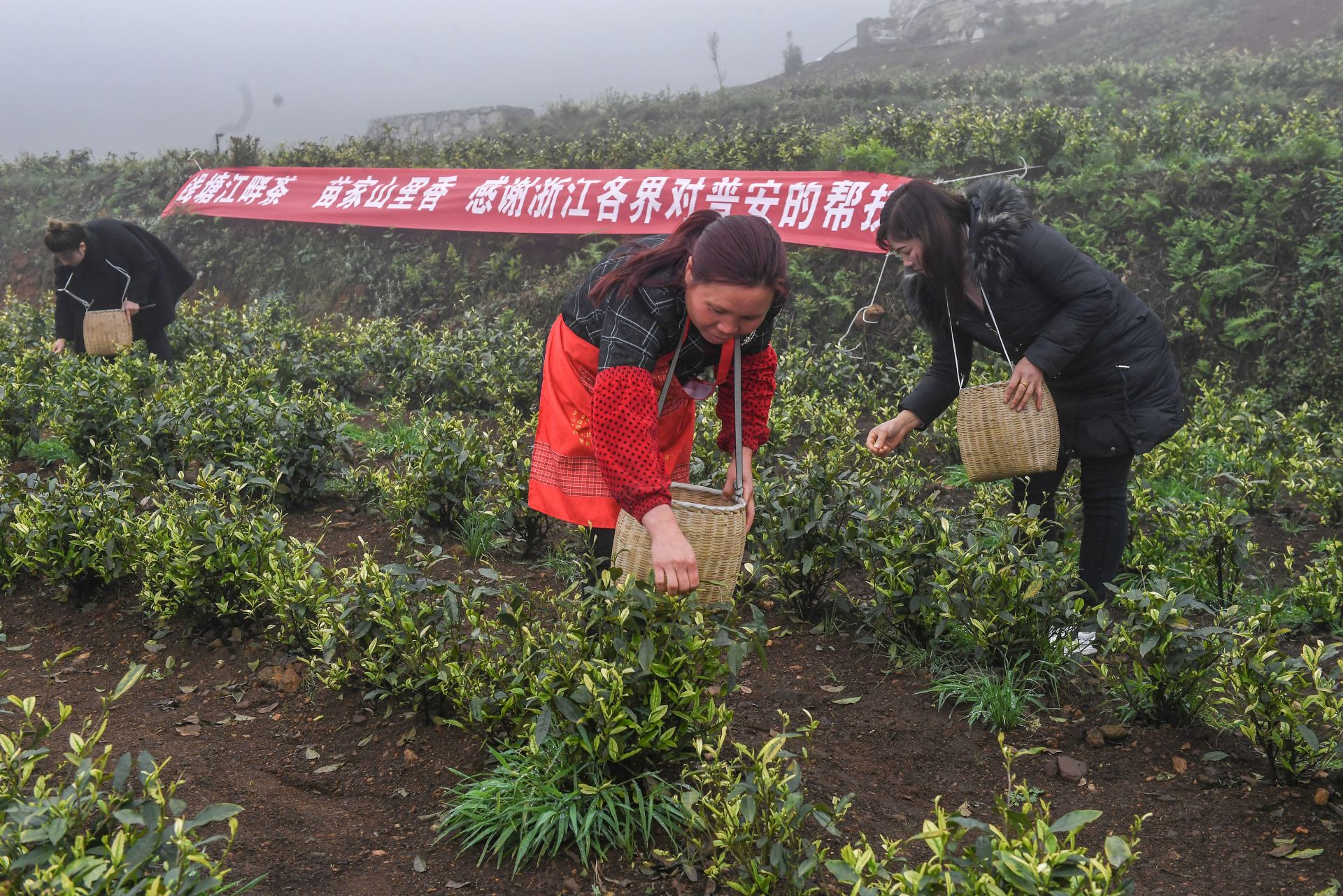 2021年4月14日,工人在貴州省黔西南州普安縣地瓜鎮屯上村“白葉一號”感恩茶園採茶。這片茶園由浙江省安吉縣捐贈。