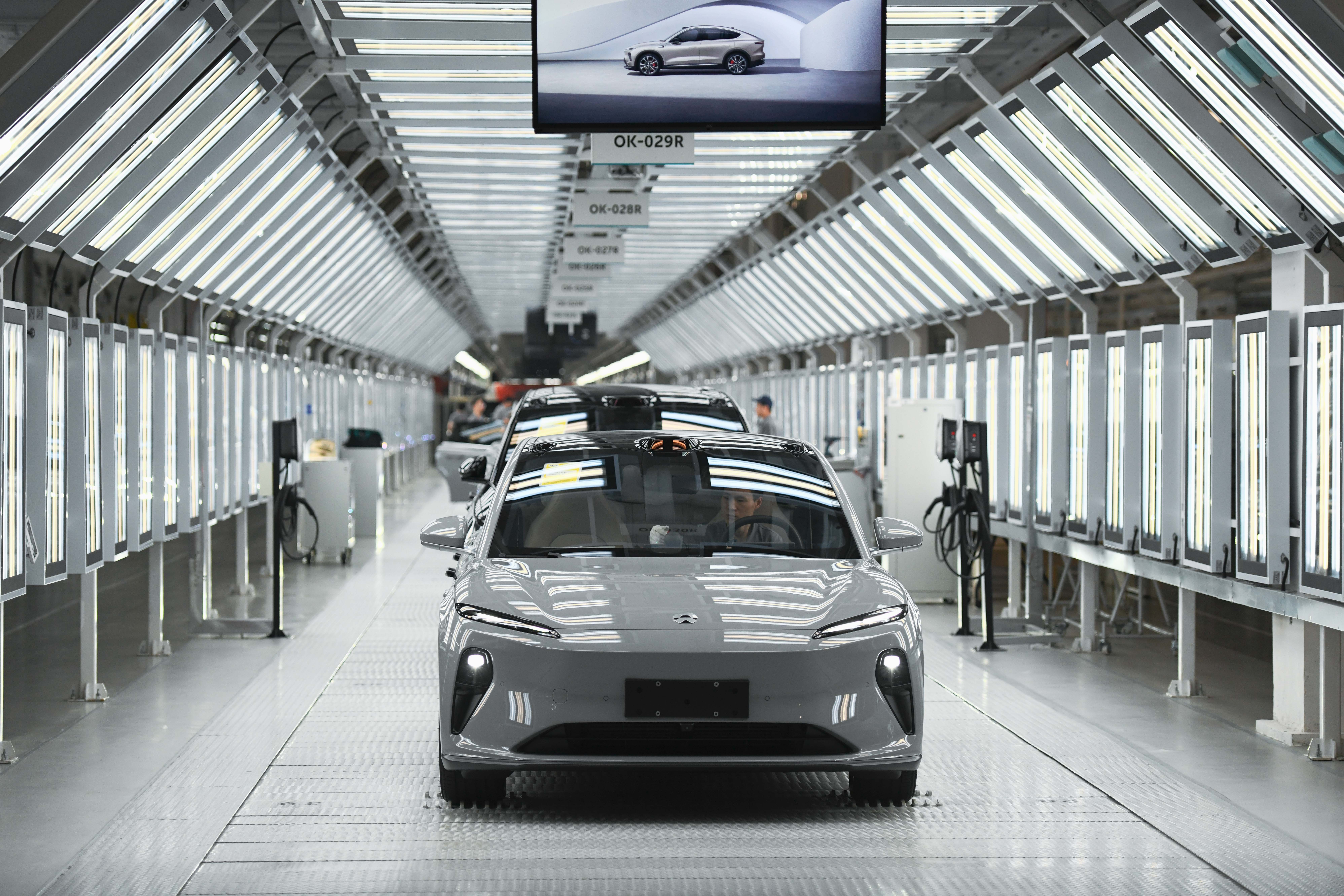 這是在安徽合肥新橋智能電動汽車產業園蔚來第二工廠拍攝的新能源汽車生產線(2024年5月9日攝)。