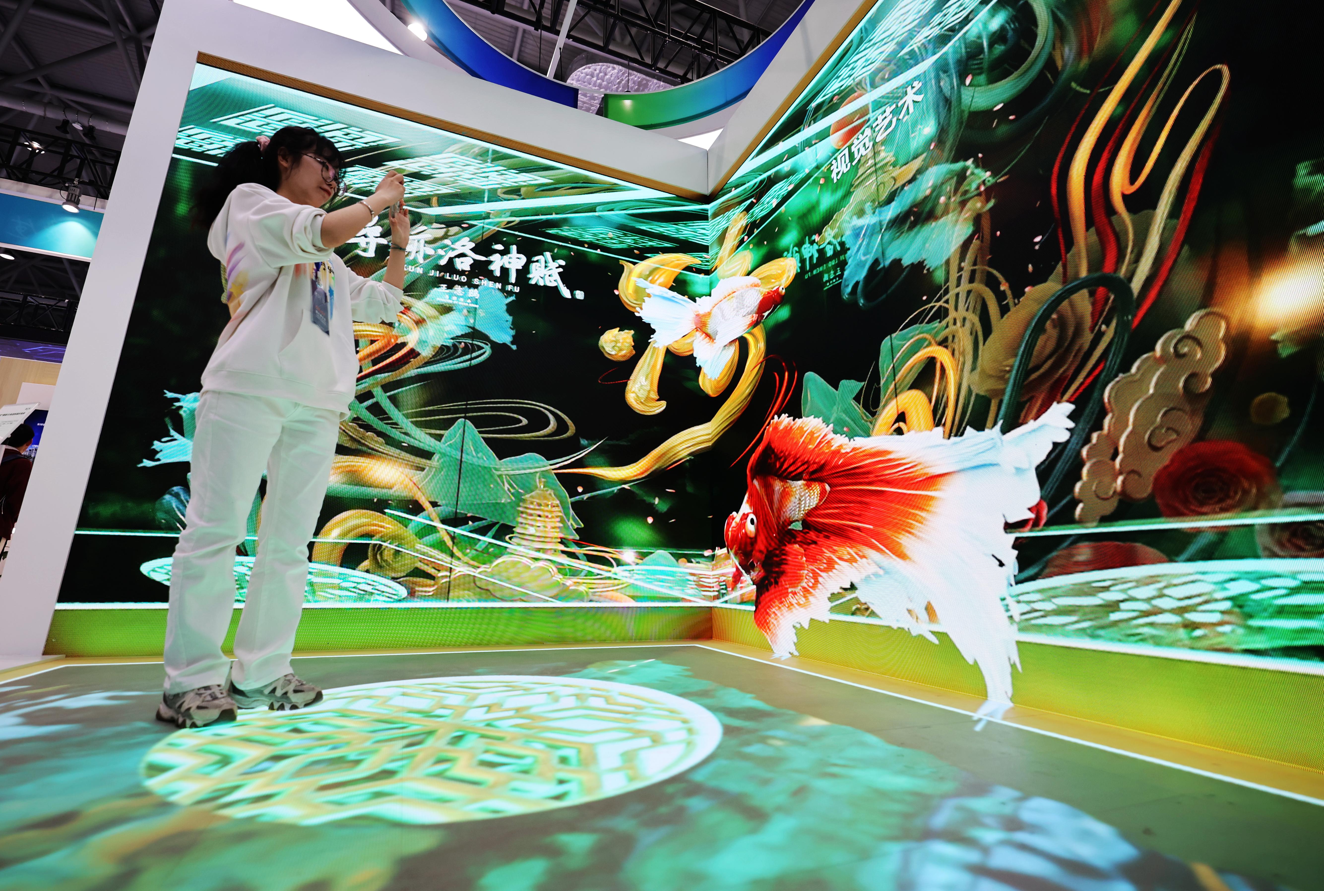 2024年4月1日,在安徽合肥舉辦的2024國際顯示技術大會上,一名觀眾體驗京東方展出的裸眼3D快速拆裝摺角屏。