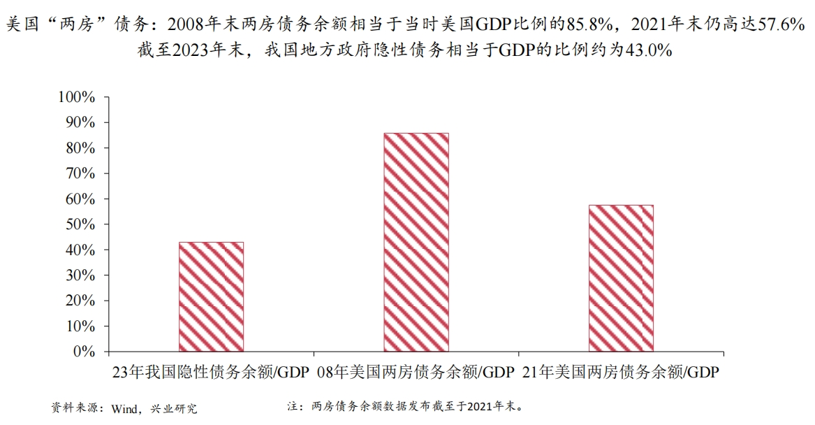 目前為止,我國公佈出來的隱性債務大概相當於GDP的多少呢?2023年的數據大概是40%多。美國的“兩房”債務大概佔GDP的比重是多少?2008年金融危機時,大概是90%。2021年的數據依然是60%多,不到70%,而中國是40%-50%之間。