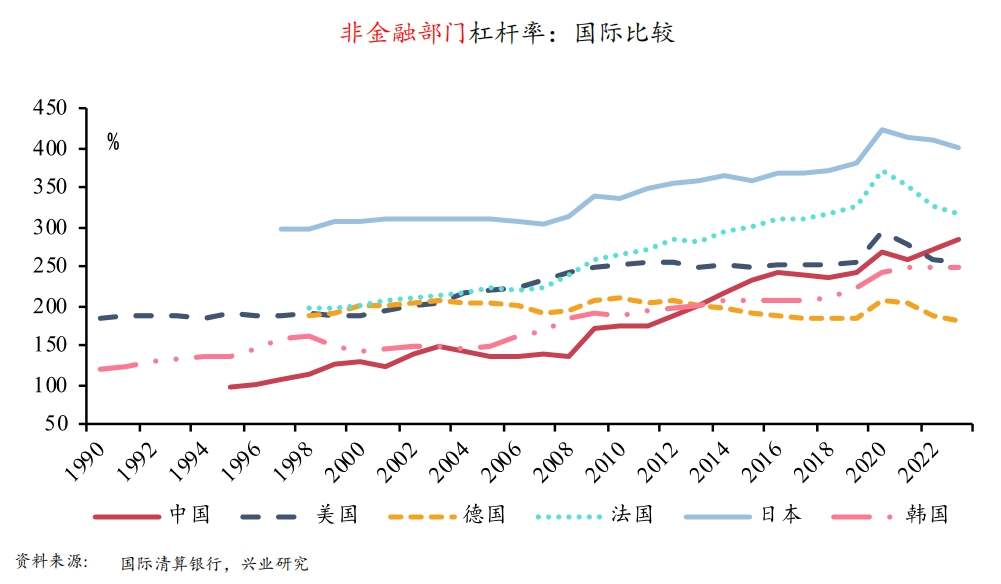 但大家是否注意到,如果把我國非金融部門的槓桿率和主要國家進行比較會發現:2022年之後,我國非金融部門的槓桿率已經超過了美國,也明顯超過了德國,正在接近法國的水平。