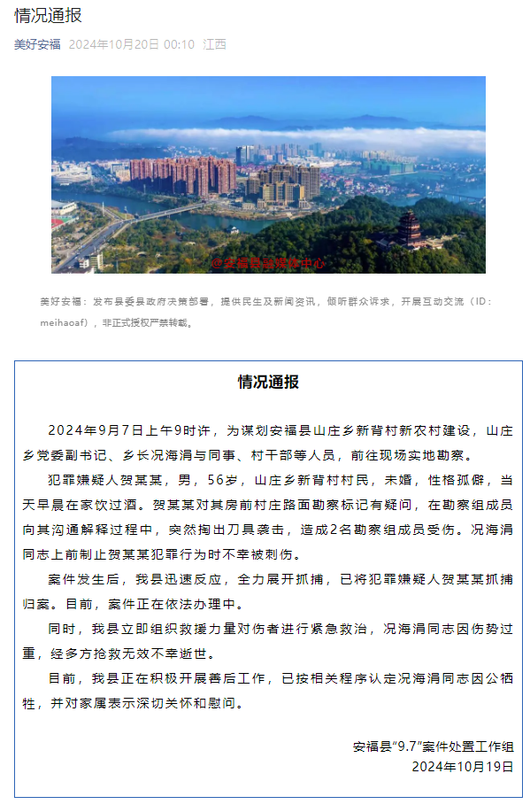 10月19日,江西安福縣“9.7”案件處置工作組發佈情況通報: