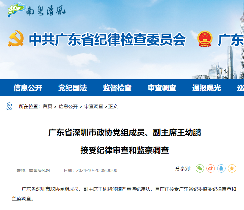 南粵清風網10月20日消息,廣東省深圳市政協黨組成員、副主席王幼鵬涉嫌嚴重違紀違法,目前正接受廣東省紀委監委紀律審查和監察調查。
