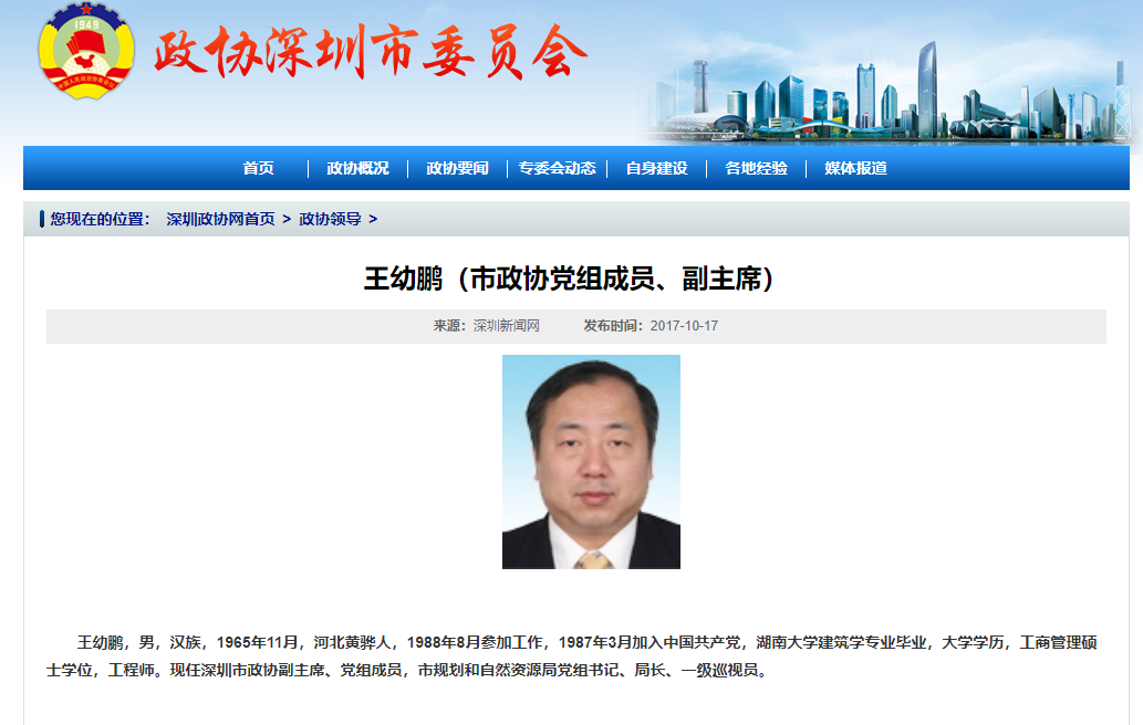 深圳新聞網顯示,王幼鵬,男,漢族,1965年11月,河北黃驊人,1988年8月參加工作,1987年3月加入中國共產黨,湖南大學建築學專業畢業,大學學歷,工商管理碩士學位,工程師。現任深圳市政協副主席、黨組成員,市規劃和自然資源局黨組書記、局長、一級巡視員。