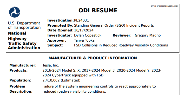 NHTSA表示,在接到四起事故報告後,他們決定展開調查。這些事故報告顯示,事故均發生在特斯拉的輔助駕駛系統FSD啓動時,由於道路能見度降低(如強光、大霧或揚塵),車輛發生了碰撞。