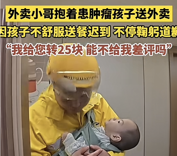 視頻下方還標註着“外賣小哥抱着患腫瘤孩子送外賣,因孩子不舒服送餐遲到,不停鞠躬道歉”等文字。
