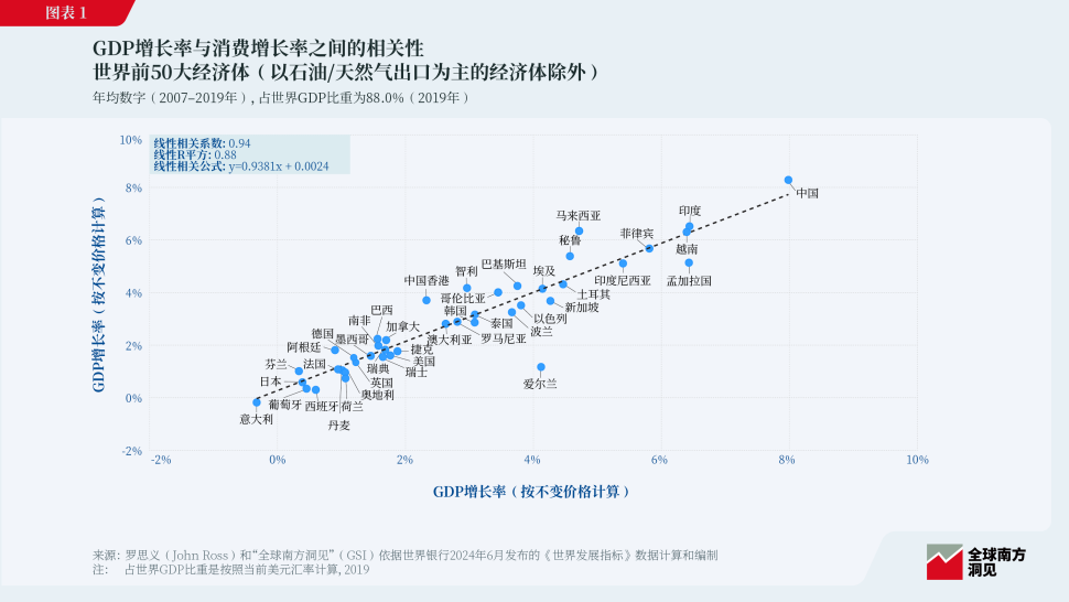 因此,綜合這兩個事實可以看出,固定資本形成淨額佔GDP比重與消費增長率之間也存在較強的正相關性,圖2中的數據充分印證了這一點。世界前50大經濟體(石油/天然氣出口國除外)的固定資本形成淨額佔GDP比重與消費增長率之間的相關性極高,為0.84。也就是説,固定資本形成淨額佔GDP比重越高,總消費增長速度就越快。