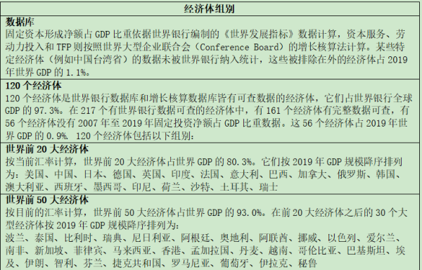 索洛的增長核算公式將生產投入分為三種:資本、勞動力和全要素生產率(TFP)——最後一種是指經濟增長中不能夠被資本和勞動力等要素投入所解釋的部分【3】。但是,索洛最初的公式存在一些缺陷,後來的研究人員對其進行了改進【4】。經過這些修正後,增長核算法成為分析經濟增長的一整套統計方法。因此,本系列研究所採用的數據是按照增長核算法計算。