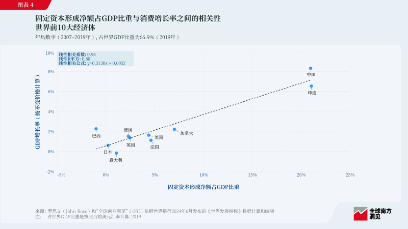轉到超大經濟體。包括中國在內的世界前10大經濟體,其固定資本形成淨額佔GDP比重與消費增長率之間的相關性更高,為0.94(見圖4)。