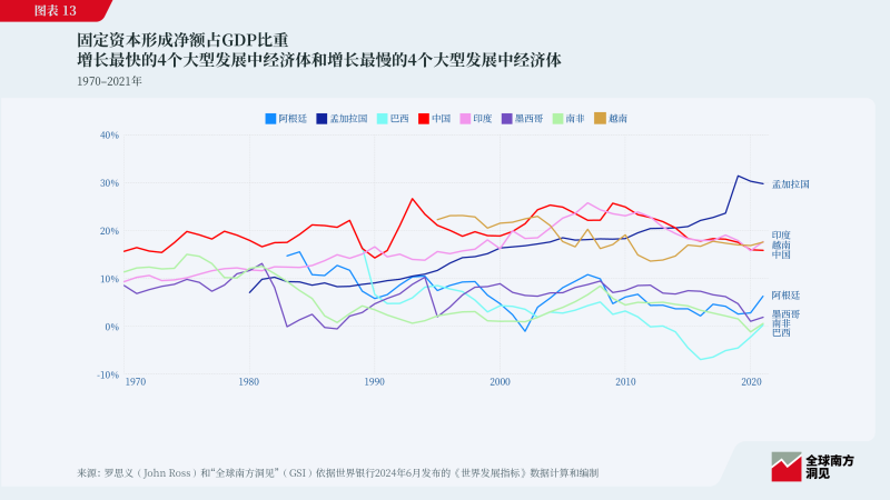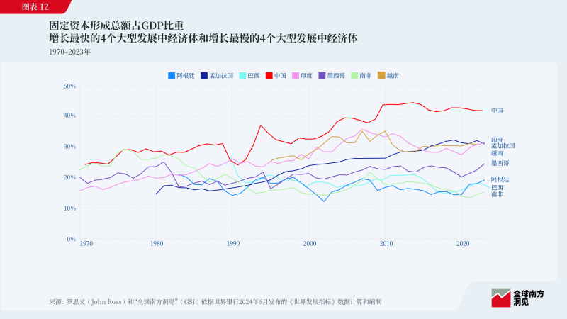 圖12同樣呈現的是固定資本形成總額佔GDP比重數據,但在增長最快的4個大型發展中經濟體的基礎上,我們增加了增長最慢的4個全球南方大型經濟體——阿根廷、巴西、墨西哥和南非。可以看出,雖然增長最快的4個全球南方經濟體的固定資本形成總額水平長期性地穩步提高,但增長緩慢的全球南方經濟體並非如此。