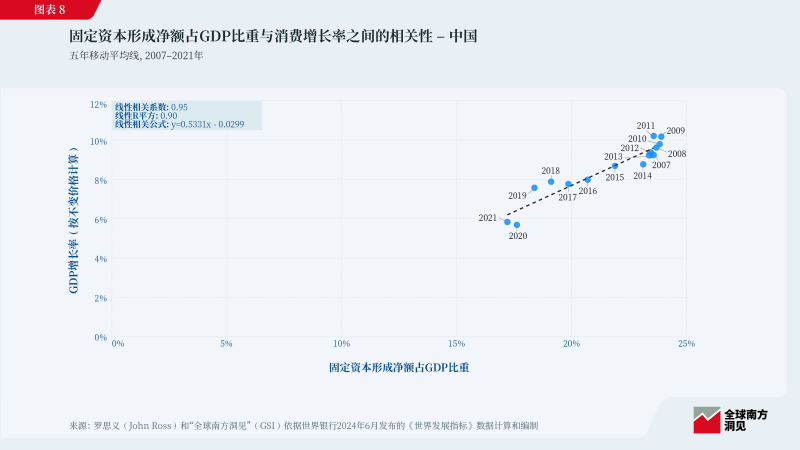分析中國國內數據就會發現,中國的表現完全符合世界趨勢。如圖8所示,首先呈現的是中國固定資本形成淨額佔GDP比重與消費增長率之間的相關性。這種正相關性超高,為0.95,R平方值也為超高的0.90。也就是説,固定資本形成淨額佔中國GDP比重越高,中國消費增長速度就越快。