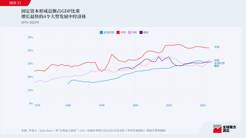 對中國和增長最快的全球南方經濟體的實證分析,有力地印證了這一分析/理論觀點。如圖11所示,世界前50大經濟體中增長最快的4個全球南方經濟體——中國、印度、孟加拉國和越南——固定資本形成總額佔GDP比重都是持續提高,而非急劇提高。