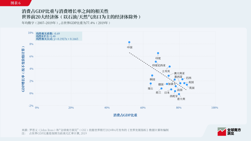 但經濟體規模越大,消費率與消費增長率之間的負相關性就越強。因此,世界前20大經濟體(石油/天然氣出口國除外)的消費率與消費增長率之間的負相關性上升至中等顯著水平,為-0.69(見圖6)。