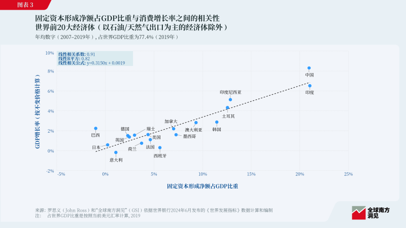 (2)佔世界GDP77%的世界前20大經濟體(石油和天然氣出口國除外),其固定資本形成淨額佔GDP比重與GDP增長率之間存在超高的正相關性,為0.93。