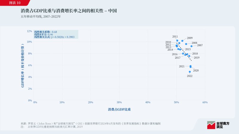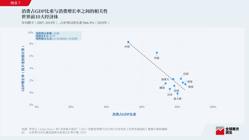 包括中國在內的世界前10大經濟體,消費率與消費增長率之間的負相關性則上升至非常高的水平,為-0.85(見圖7)。