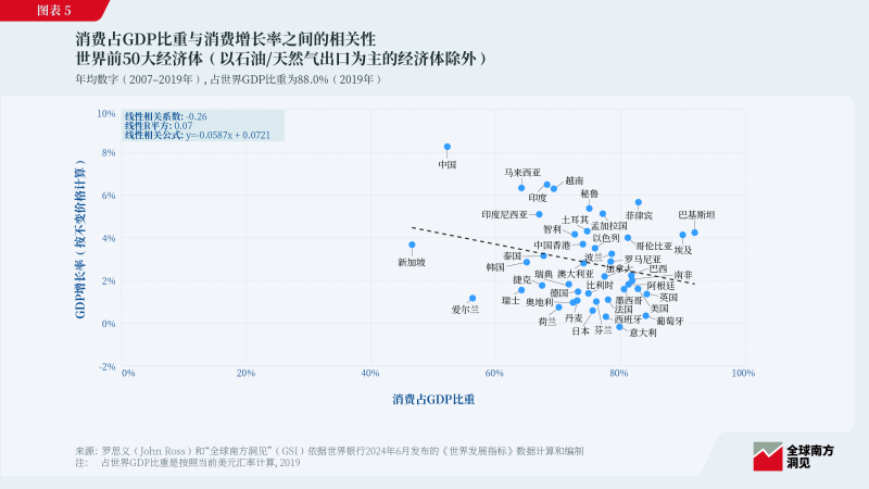 因此,如圖5所示,世界前50大經濟體(石油/天然氣出口國除外)的消費率與消費增長率之間存在負相關性,這種相關性較弱,僅為-0.26。