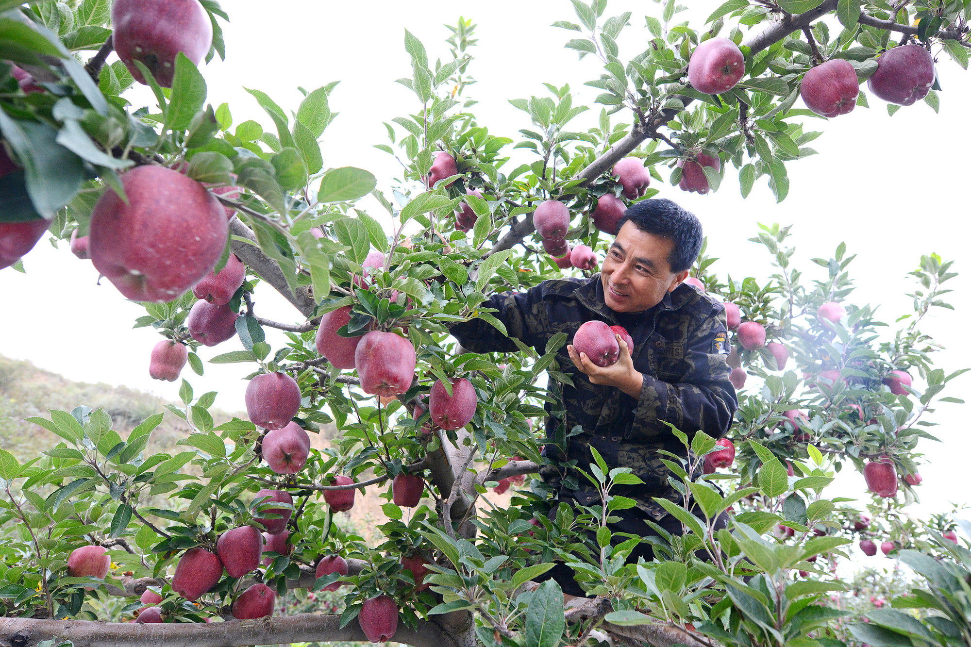 果農在採摘花牛蘋果