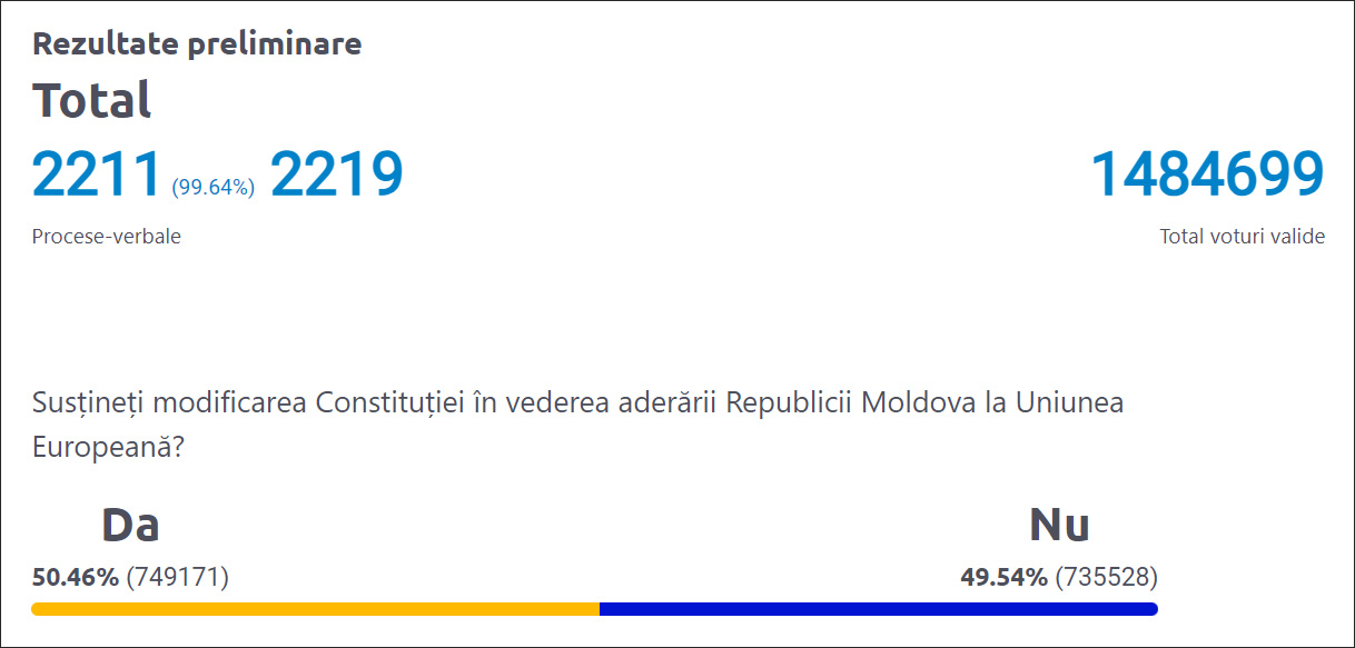 但到了21日上午,投票結果逐漸逆轉,隨着海外摩爾多瓦僑民的選票得到統計,支持票的數量快速增加,最終以極為微弱的優勢實現反超。摩爾多瓦中央選舉委員會發布的結果顯示,超過148.4萬人參加了公投,在統計99.64%的選票後,約50.46%的選民支持加入歐盟,親歐派已基本確定獲勝。