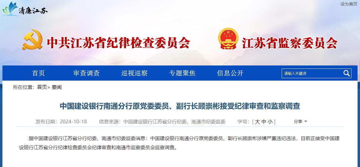 中國建設銀行南通分行原副行長顧崇彬接受紀律審查和監察調查 guancha 2024-10-21 據江蘇紀檢監察網站21日消息:中國建設銀行南通分行原黨委委員、副行長顧崇彬涉嫌嚴重違紀違法,目前正接受中國建設銀行江蘇省分行紀律檢查委員會紀律審查和南通市監察委員會監察調查。
