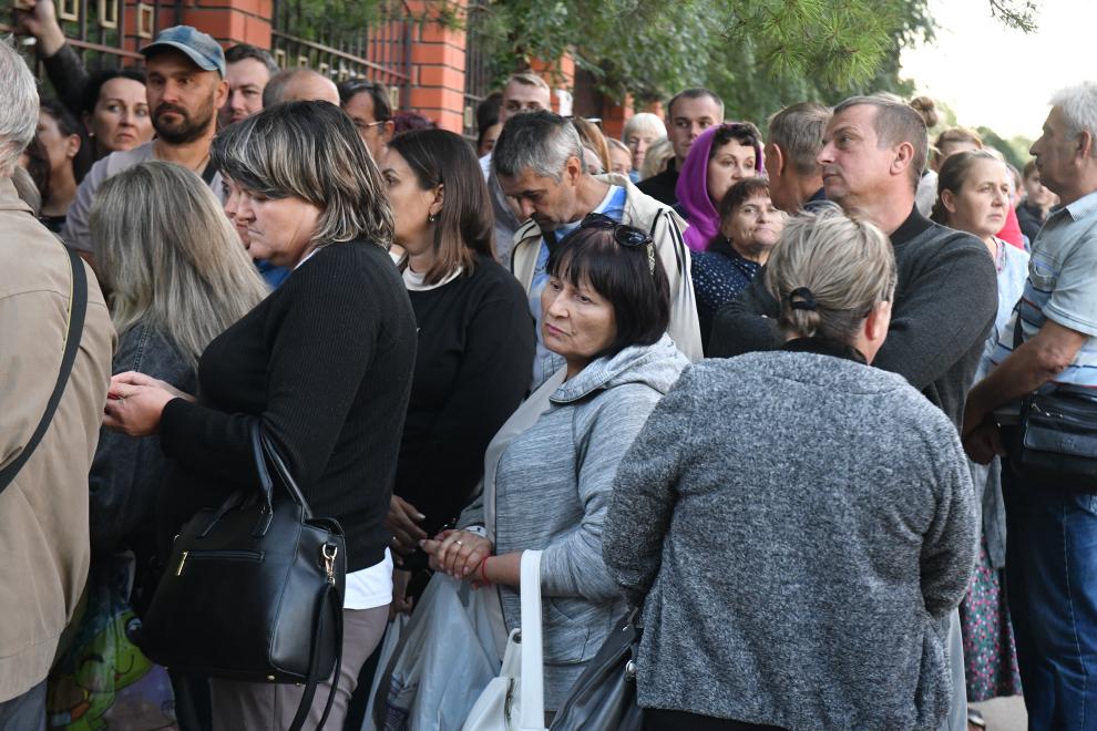2024年8月13日,在俄羅斯庫爾斯克市,來自俄烏邊境地區的居民排隊領取救援物資。 新華社