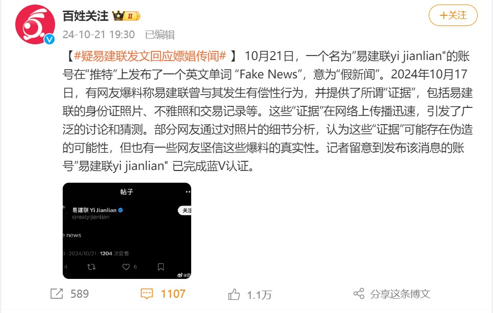 10月21日,媒體“百姓關注”發微博稱,一個名為“易建聯Yi Jianlian”的賬號在外網社交平台“推特”上發佈 “fake news”,意為“假新聞”。微博話題為“疑易建聯發文回應嫖娼傳聞”。