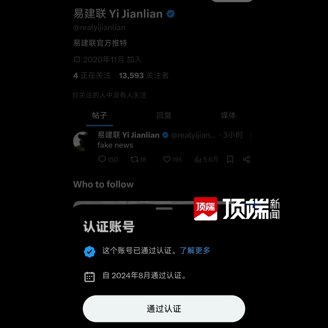 多位“推特”用户告訴記者,該賬號雖認證信息為“易建聯官方推特”,但推特藍標認證不等同於實名認證,是不是易建聯本人賬號有待考證。一在泰中國留學生解釋説,推特通過郵箱認證,或一年繳費648元,即可成為會員並享有藍標認證。