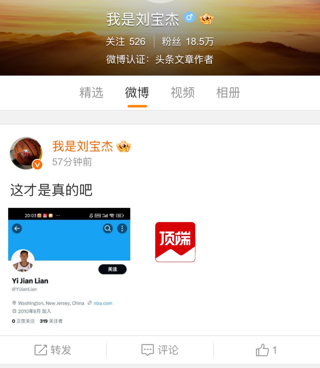 10月21日晚,微博認證用户@我是劉寶傑 也發文,曬出疑似易建聯本人的推特賬號並截圖稱“這才是真的吧”。截圖賬號為2010年8月註冊,並在簡介中鏈接了NBA官方網站。至於兩個賬號是否為易建聯本人註冊,目前仍無法確定。