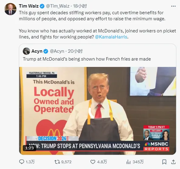 哈里斯陣營當然知道特朗普打工秀是有正面效果的,肯定很難受,因為他們不好説什麼。最後,他們選擇讓副總統候選人Tim Walz出來回應。Tim Walz發了個X: