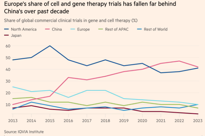 歐洲在全球CGT商業臨牀試驗中所佔的份額遠遠落後於中國 FT