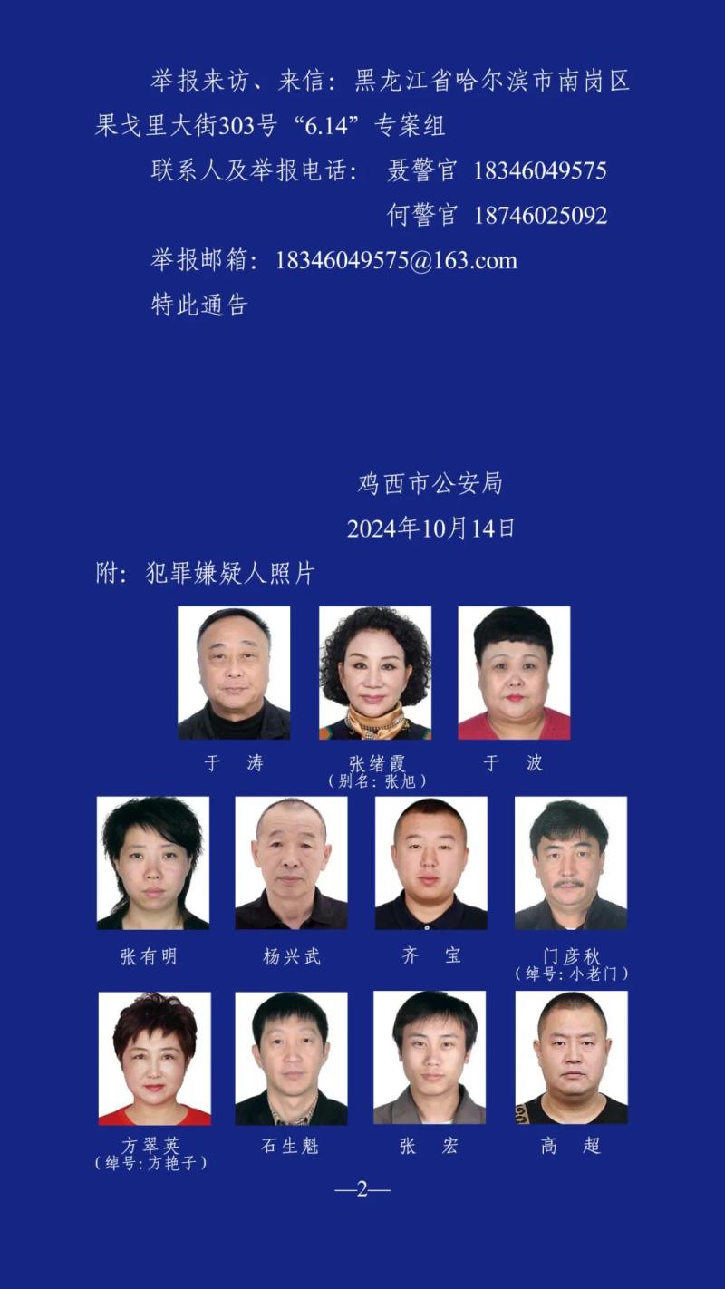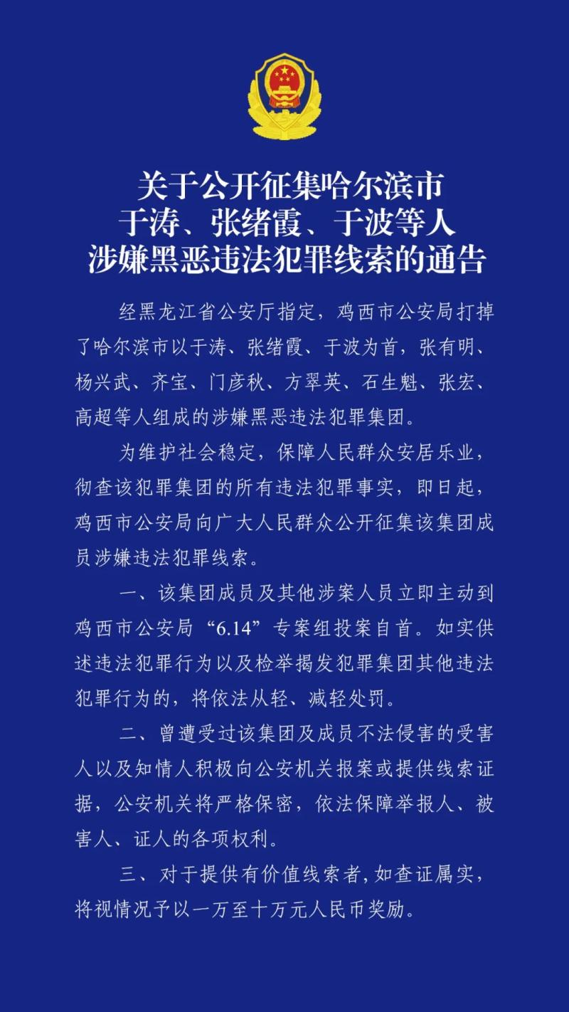 10月14日,黑龍江省雞西市警方發佈公告,徵集涉嫌黑惡違法犯罪線索:“關於公開徵集哈爾濱市于濤、張緒霞、于波等人涉嫌黑惡違法犯罪線索的通告”。