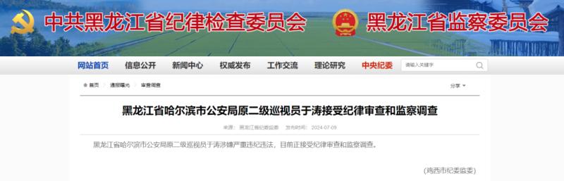 此前,根據雞西市紀委監委的消息顯示,于濤已於7月份接受紀律審查和監察調查,被查時其身份為哈爾濱市公安局原二級巡視員。