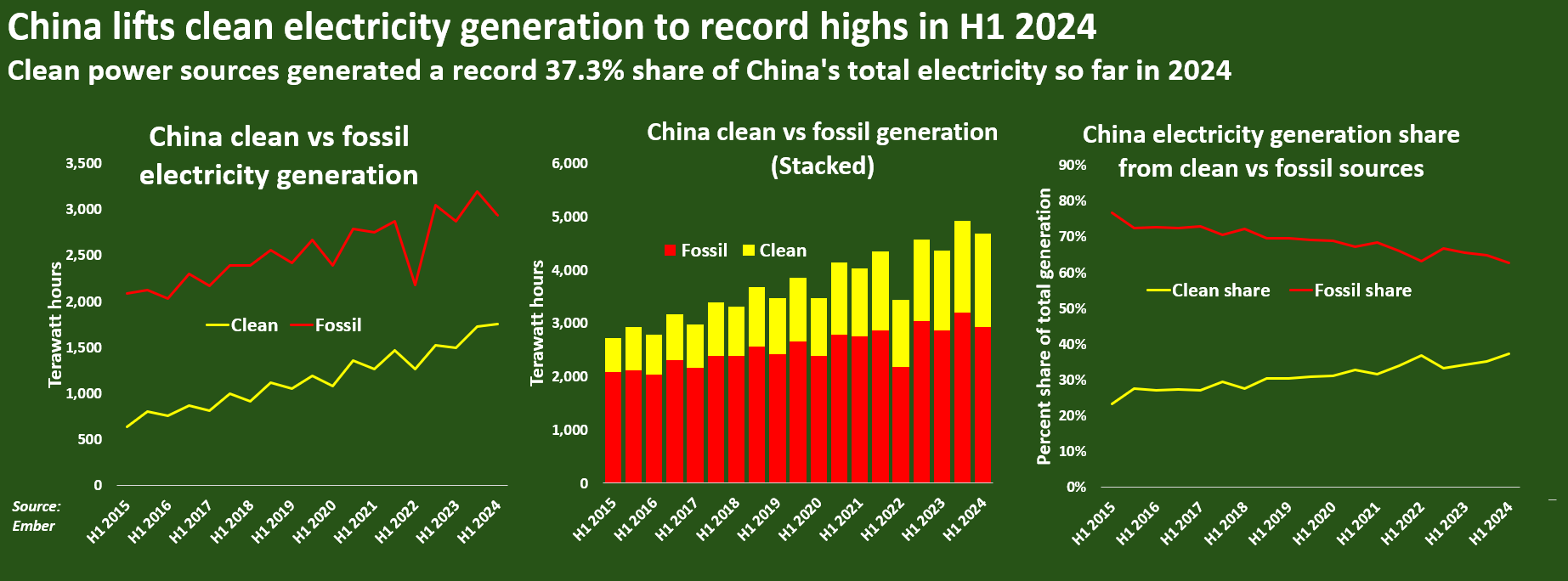 今年7月,國際能源智庫Ember在其一篇報告中指出:2024年上半年,中國清潔發電量達到了1,751.4太瓦時(TWh),比去年同期增長了近17%,在中國總髮電量中的佔比達到了37.3%,創下歷史新高,而煤炭在總髮電量中的佔比也首次下降至60%以下。