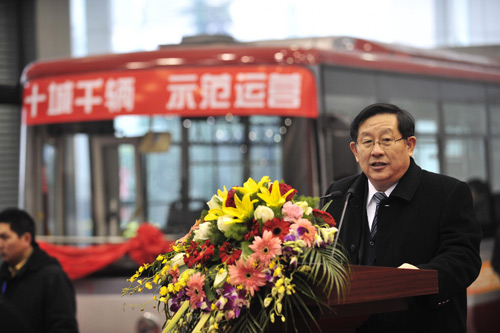 2010年,時任科技部長萬鋼為武漢百輛混合動力公交車投放剪綵