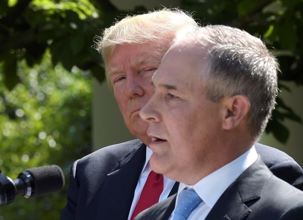 2017年6月1日,唐納德·特朗普在白宮玫瑰園聽取斯科特·普魯伊特的講話,此前特朗普曾宣佈美國將退出巴黎協定