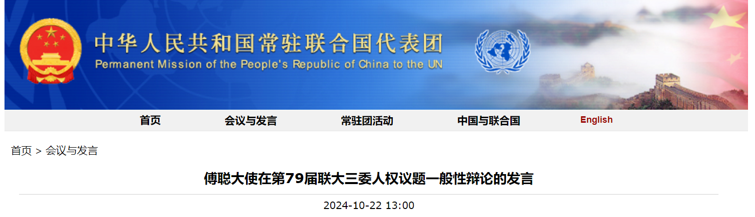 據中國常駐聯合國代表團網站消息,當地時間22日,傅聰大使在第79屆聯大三委人權議題一般性辯論上發言,全文如下: