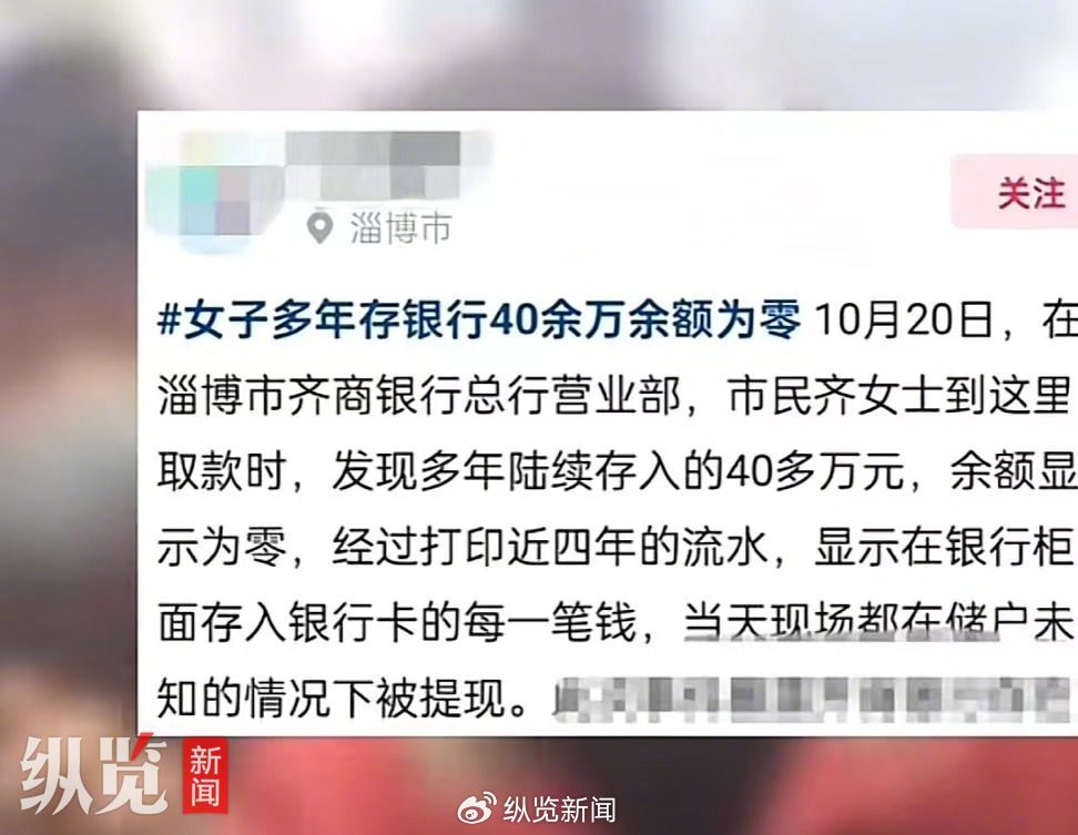 據極目新聞報道,山東淄博一女子稱多年來在淄博齊商銀行存款40多萬元,取款時餘額卻為零。10月22日下午,縱覽新聞記者以儲户身份致電齊商銀行淄博支行了解此事,工作人員表示,是該儲户將銀行卡賬户和密碼等信息泄露給了他人導致存款被取,具體信息還要向總行工作人員進一步瞭解。